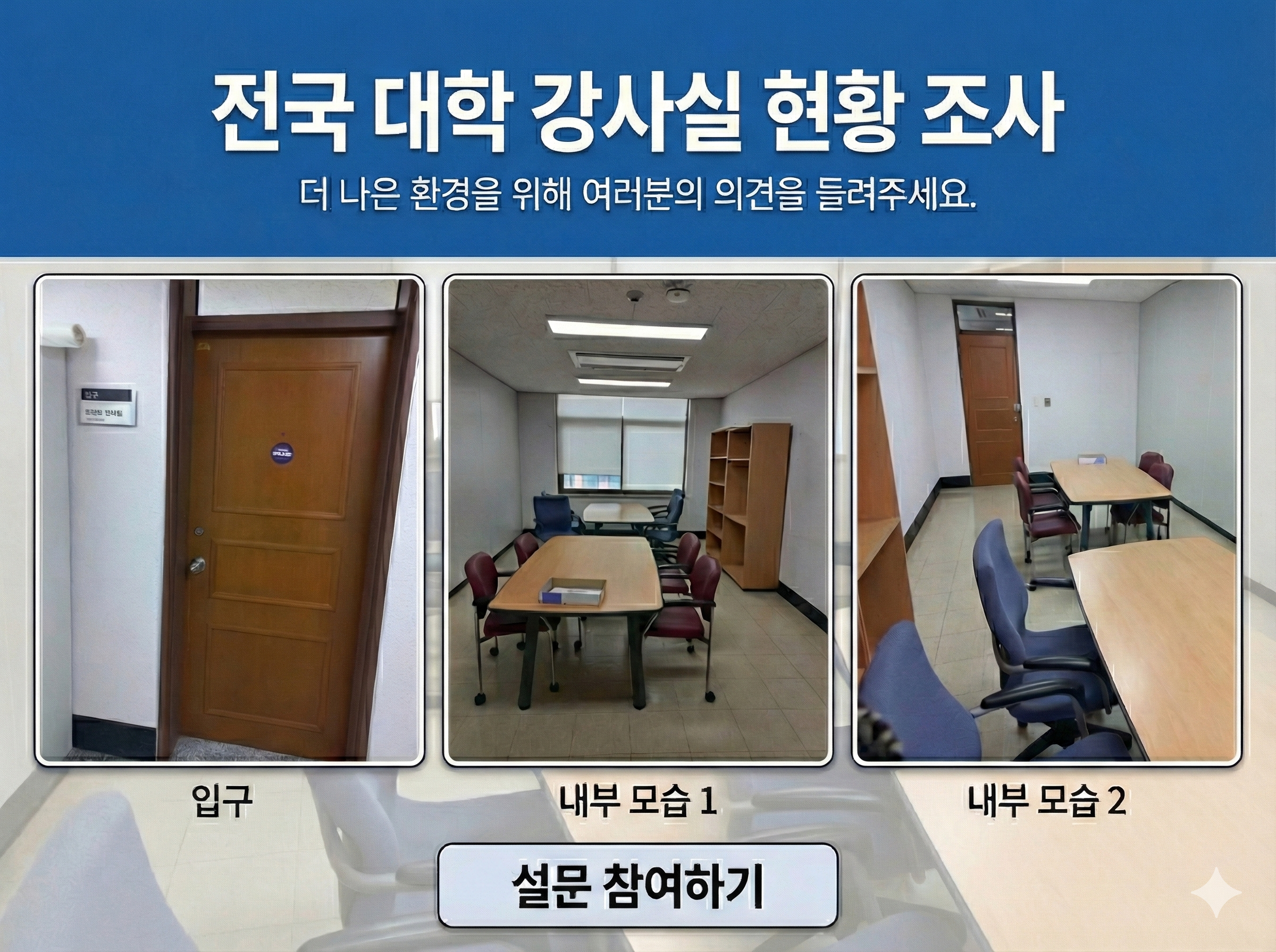 강사실 사진을 공유하실 때 대학명을 명시해 주시고, 강사실 명패와 출입구 그리고 강사실 내부 사진 2-3장(최대 10장 가능)을 올려주세요.