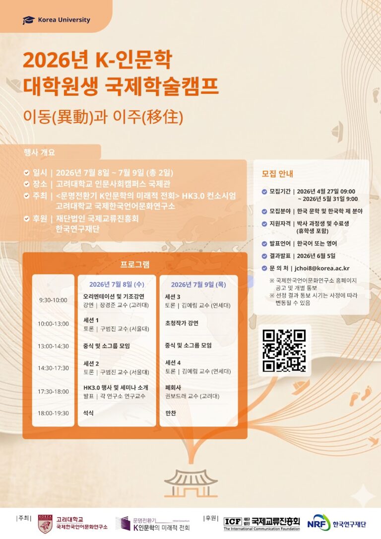 공지 내용 고려대학교 국제한국언어문화연구소 <문명전환기 K인문학의 미래적 전회> HK3.0 컨소시엄 연구단은, K-인문학의 미래를 선도하는 학문후속세대의 성장을 위해 2026년 7월 8일에서 7월 일까지 <K-인문학 대학원생 국제학술캠프>를 개최합니다. 국내외 대학 한국문학 및 한국학 전공 대학원생에게 연구 및 활동 성과를 공유할 기회를 제공하고,…