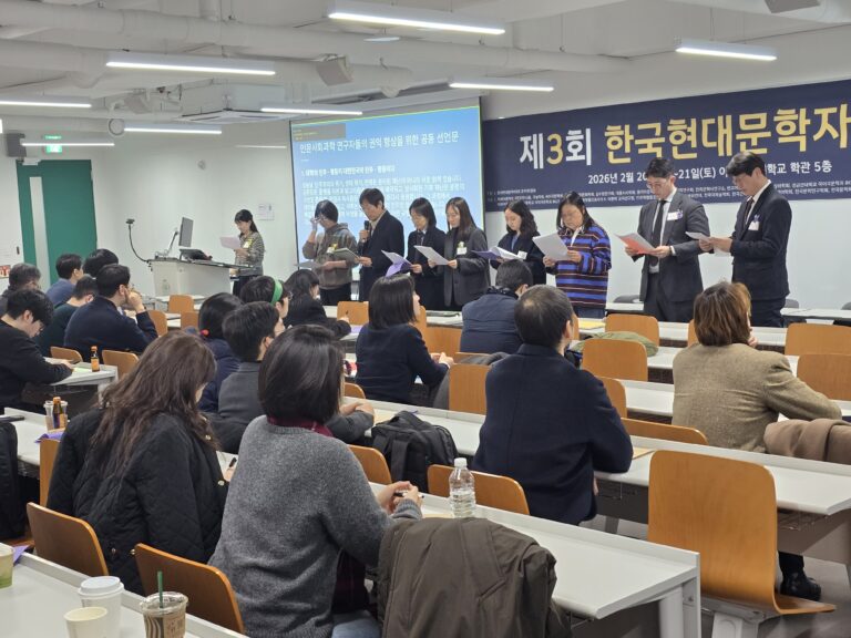465명 운집, 29개 단체 공동 주최… 인문사회과학 연구자 권익 향상 공동성명 발표 제3회 한국현대문학자대회, 2월 20~21일 이화여대서 성료 : 비정규교수 차별 철폐, 여성 연구자 권리, 대학원생 생존권, AI 학술 데이터 주권 등 핵심 의제 공론화 관련기사(교수신문): 관련 보도자료