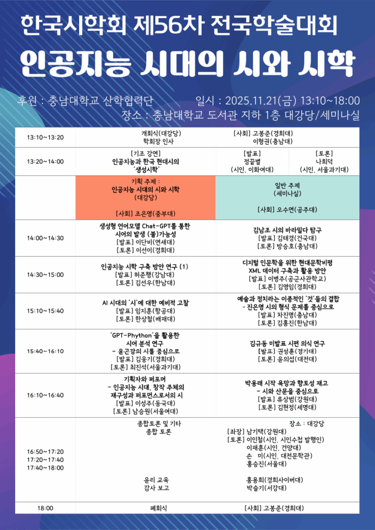 행사 정보 행사 유형: 학술대회 주최: 한국시학회 일시: 2025년 11월 21일 오후 1시 ~ 2025년 11월 21일 오후 6시 장소: 충남대학교 중앙 도서관 진행 방식: 오프라인 행사 소개 <2025년도 하반기 한국시학회 전국학술대회 기획 취지>한국시학회는 2025년 하반기 전국학술대회의 주제를 ‘인공지능 시대의…
