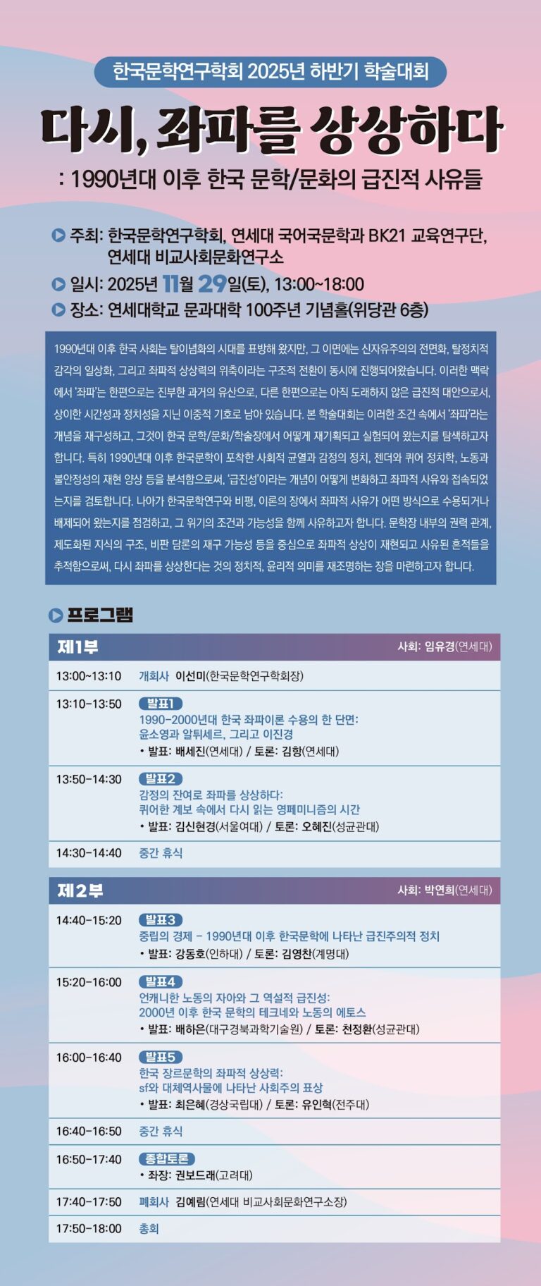 행사 정보 행사 유형: 학술대회 주최: 한국문학연구학회, 연세대 국어국문학과 BK21 교육연구단, 연세대 비교사회문화연구소 일시: 2025년 11월 29일 오후 1시 ~ 2025년 11월 29일 오후 6시 장소: 연세대학교 문과대학 100주년 기념홀(위당관 6층) 진행 방식: 오프라인 행사 소개 한국문학연구학회 회원 여러분께, 선생님,…