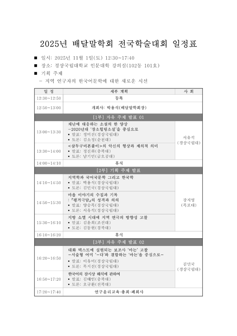 행사 정보 행사 유형: 학술대회 일시: 2025년 11월 1일 오후 12시 30분 ~ 2025년 11월 1일 오후 5시 40분 장소: 경상국립대학교 인문대학 강의실 102동 101호 진행 방식: 오프라인 행사 소개 배달말학회에서는 2025년 전국 학술대회를 다음과 같이 개최할 예정입니다. 이번 학술대회는…