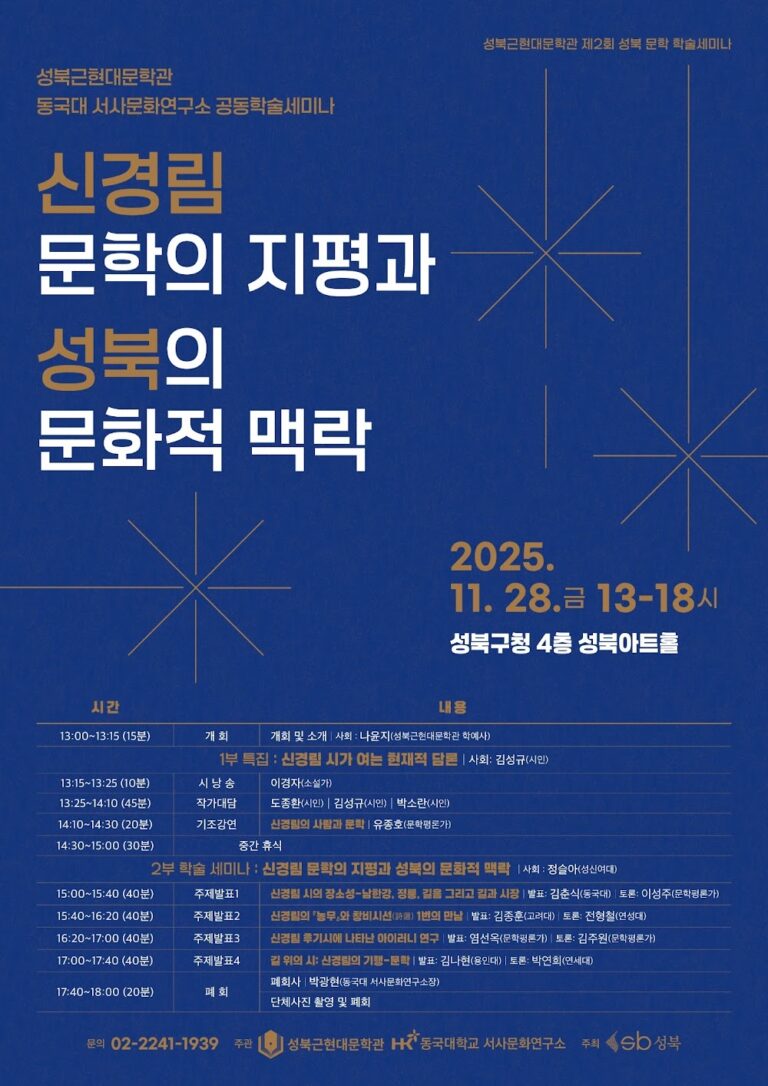 행사 정보 행사 유형: 학술대회 주최: 성북구청 일시: 2025년 11월 28일 오후 1시 ~ 2025년 11월 28일 오후 6시 장소: 성북구청 4층 성북아트홀 진행 방식: 오프라인 행사 소개 신경림 시인 1주기를 맞아 성북근현대문학관 제2회 성북문학 학술세미나를 동국대 서사문화연구소와 함께 개최합니다.…