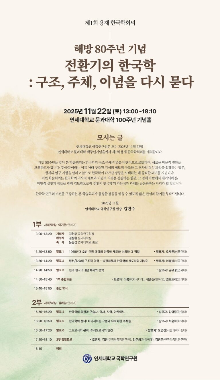 행사 정보 행사 유형: 학술대회 주최: 연세대학교 국학연구원 일시: 2025년 11월 22일 오후 1시 ~ 2025년 11월 22일 오후 6시 10분 장소: 연세대학교 문과대학 100주년 기념홀 진행 방식: 오프라인 행사 소개 〈모시는 글〉 연세대학교 국학연구원은 오는 2025년 11월 22일 연세대학교…