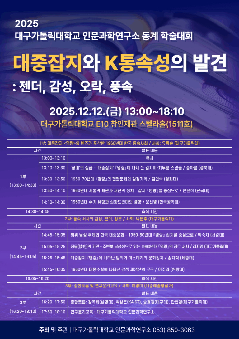 행사 정보 행사 유형: 학술대회 주최: 대구가톨릭대학교 인문과학연구소 일시: 2025년 12월 12일 오후 1시 ~ 2025년 12월 12일 오후 6시 10분 장소: 대구가톨릭대학교 E10 참인재관 스텔라홀(1511호) 진행 방식: 오프라인 행사 소개 1956년 창간한 대중오락잡지 <명랑>은 전후 한국 사회에서 통속문화의 욕망과…