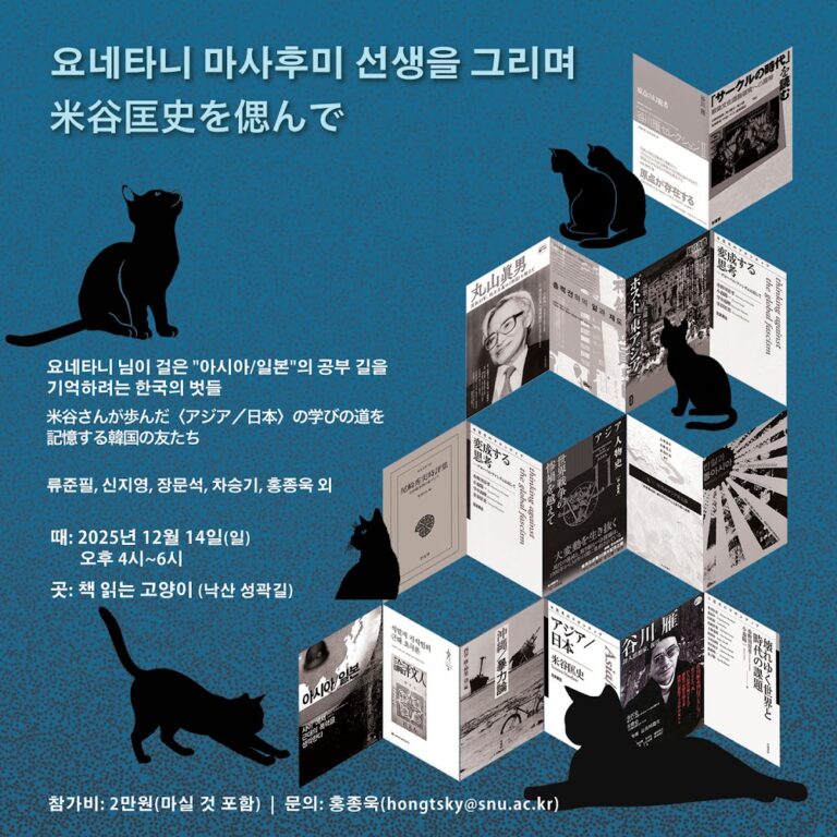 행사 정보 행사 유형: 학술답사 주최: 요네타니 님이 걸은 "아시아/일본"의 공부길을 기억하려는 한국의 벗들 (米谷さんが歩んだ<アジア/日本>の学びの道を記憶すふ韓国の友たち) 일시: 2025년 12월 14일 오후 4시 ~ 2025년 12월 14일 오전 6시 장소: 책 읽는 고양이 (낙산 성곽길) 진행 방식: 오프라인 행사 소개 "괴로움으로 몸부림치는…