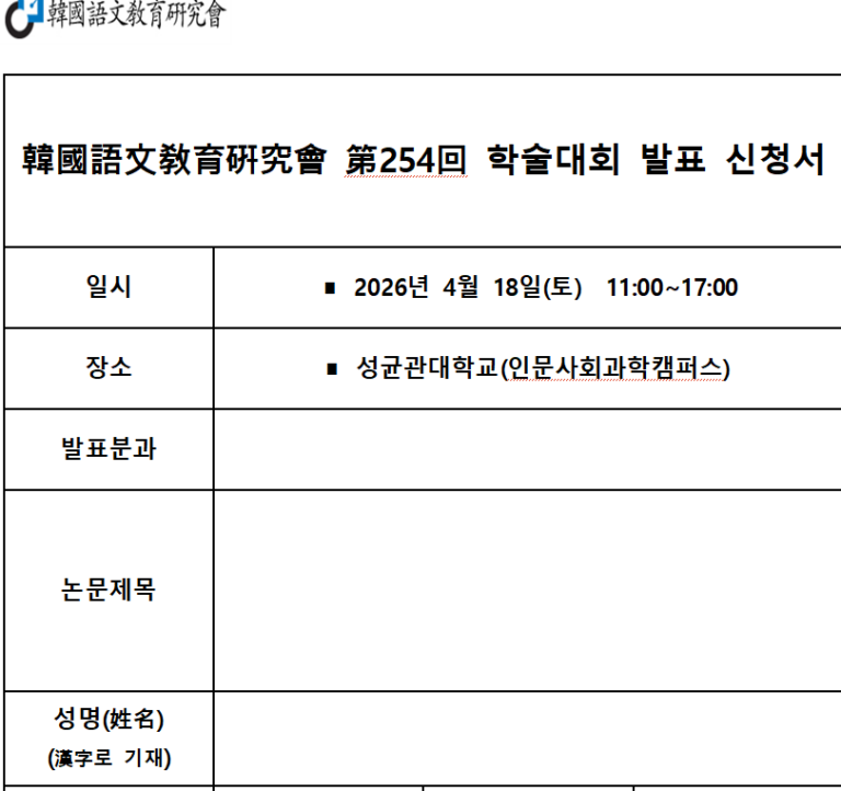 공지 내용 학술대회 일시 : 2026년 4월 18일 토 장소 : 성균관대학교(인문사회과학캠퍼스) 마감일 : ASAP * 발표비 5만원 지급 * 발표 희망자는 링크에 양식을 채워서 kles@hanja.re.kr로 제출 관련 링크 🔗 공지 링크 바로가기 주최 한국어문교육연구회 첨부 자료 클릭하면 크게 볼…