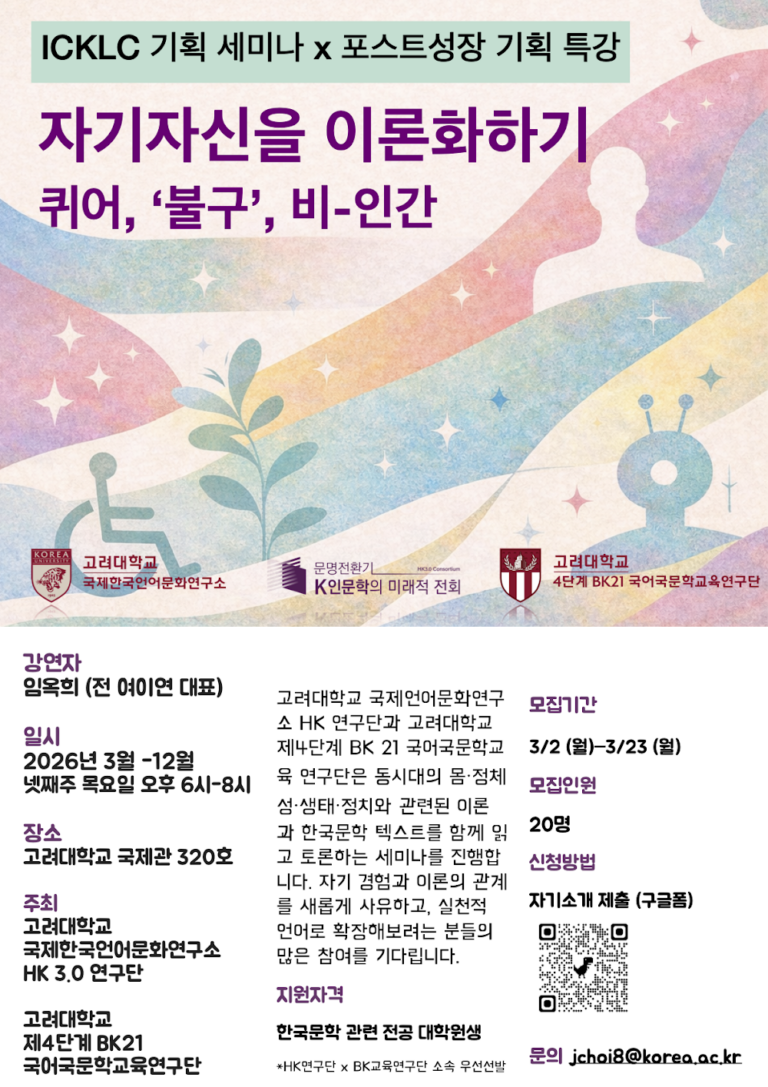 공지 내용 내용 고려대학교 국제한국언어문화연구소 HK 연구단과 고려대학교 제4단계 BK21 국어국문학 교육연구단은 동시대의 몸·정체성·생태·정치와 관련된 이론과 한국문학 텍스트를 연결하는 세미나를 진행합니다. 여성주의 연구자 임옥희 선생님과 함께, 자기 이론과 장애, 생태정치에 대한 텍스트를 함께 읽고 토론하려고 합니다. 자기 경험과 이론의 관계를…