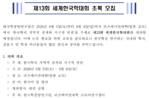 행사 정보 행사 유형: 학술대회 주최: 한국학중앙연구원, 리츠메이칸대학 코리아연구센터 일시: 2026년 9월 5일 오전 9시 ~ 2026년 9월 6일 오후…