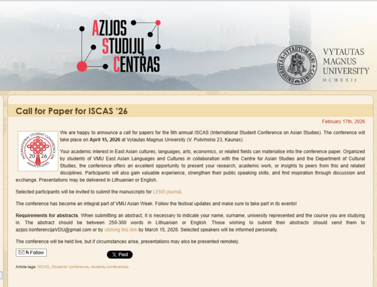 대학원생 페이퍼 모집 / 리투아니아 비우타스 마그너스 대학(구 리투아니아 대) 아시아센터 ISCAS ’26