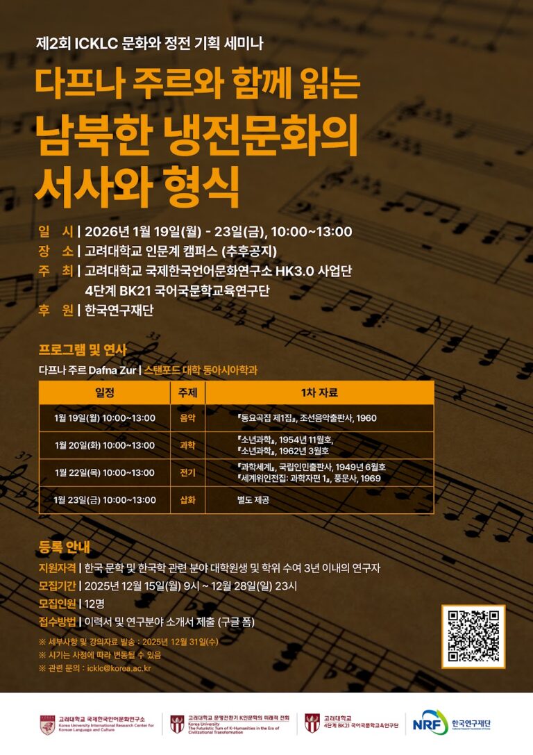 행사 정보 행사 유형: 강연 주최: 고려대학교 국제한국언어문화연구소 HK3.0사업단 일시: 2026년 1월 19일 오전 10시 ~ 2026년 1월 23일 오후 1시 장소: 고려대학교 인문사회계 캠퍼스 (미정) 진행 방식: 오프라인 행사 링크 행사 바로가기 링크 행사 소개 오는 2026년 1월 19일-23일,…