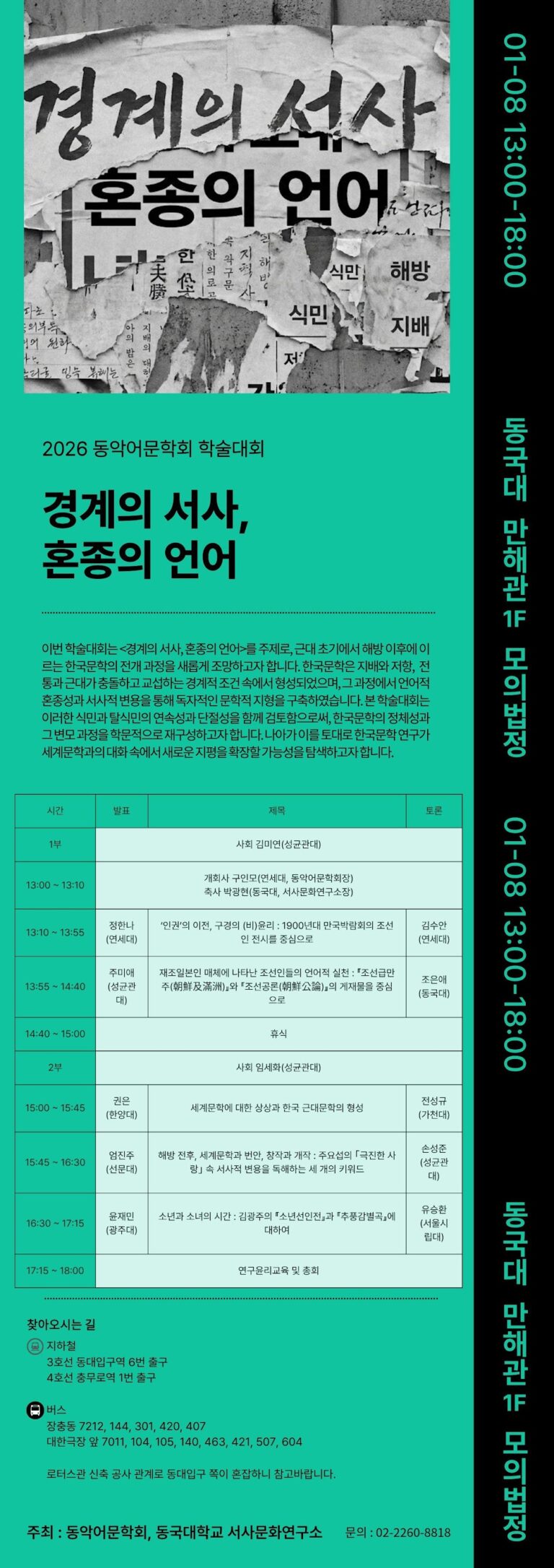 행사 정보 행사 유형: 학술대회 주최: 연세대학교 국어국문학과 BK21 교육연구단, 연세대학교 영어영문학과 BK21 교육연구단 일시: 2026년 1월 29일 오전 10시 ~ 2026년 1월 29일 오후 5시 10분 장소: 연세대학교 위당관 백주년 기념홀, 414호, 416호 진행 방식: 오프라인 행사 링크 행사…