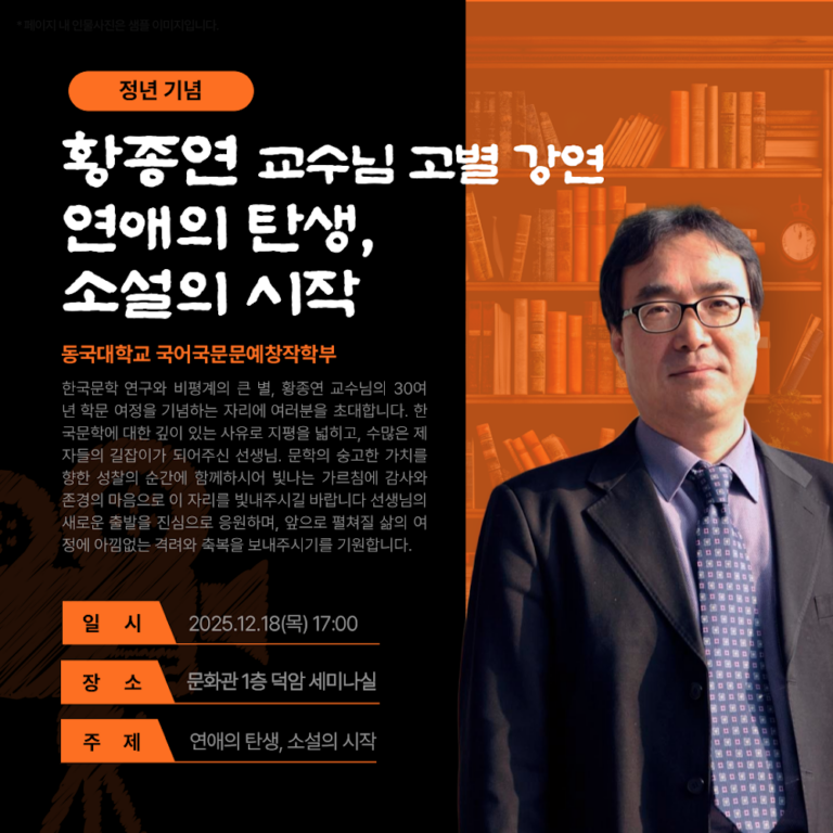 행사 정보 행사 유형: 강연 주최: 동국대학교 국어국문문예창작학부 일시: 2025년 12월 18일 오후 5시 ~ 2025년 12월 18일 오후 7시 장소: 동국대학교 문화관 1층 덕암세미나실 진행 방식: 오프라인 행사 소개 동국대학교 국어국문문예창작학부 황종연 교수님의 정년기념 고별 강연과 관련하여, 다음과 같이…
