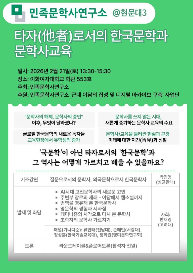 행사 정보 행사 유형: 학술대회 주최: 민족문학사연구소 일시: 2026년 2월 21일 오후 1시 30분 ~ 2026년 2월 21일 오후 3시 30분 장소: 이화여자대학교 학관 553호 진행 방식: 오프라인 행사 소개 문학사를 어떻게 다시 인식하고 가르칠 수 있을까요? 문학사의 종언과 해체,…