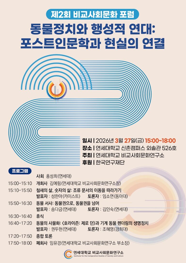 행사 정보 행사 유형: 학술대회 주최: 연세대학교 비교사회문화연구소 일시: 2026년 3월 27일 오후 3시 ~ 2026년 3월 27일 오후 6시 장소: 연세대학교 신촌캠퍼스 외솔관 526호 진행 방식: 오프라인 행사 소개 2000년대 이후 인문학 연구장은 인간중심주의를 반성하면서 비인간 존재와의 감응, 물질적…