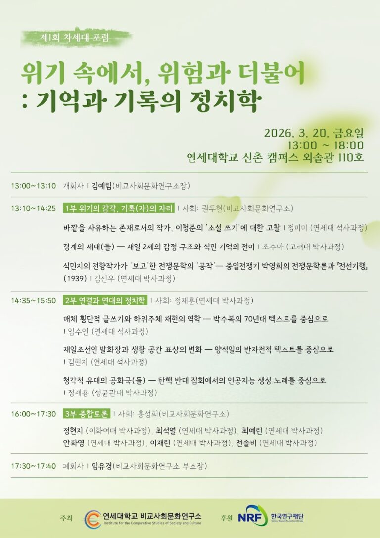 행사 정보 행사 유형: 학술대회 주최: 연세대학교 비교사회문화연구소 일시: 2026년 3월 20일 오후 1시 ~ 2026년 3월 20일 오후 6시 장소: 연세대학교 외솔관 110호 진행 방식: 오프라인 행사 링크 행사 바로가기 링크 행사 소개 연세대학교 비교사회문화연구소가 제1회 <차세대 포럼>을 개최합니다.…