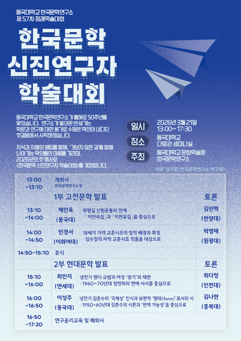 행사 정보 행사 유형: 학술대회 주최: 동국대학교 문화학술원 한국문학연구소 일시: 2026년 3월 21일 오후 1시 ~ 2026년 3월 21일 오후 5시 30분 장소: 동국대학교 서울캠퍼스 다향관 세미나실 진행 방식: 오프라인 행사 링크 행사 바로가기 링크 행사 소개 동국대학교 한국문학연구소가 올해로…