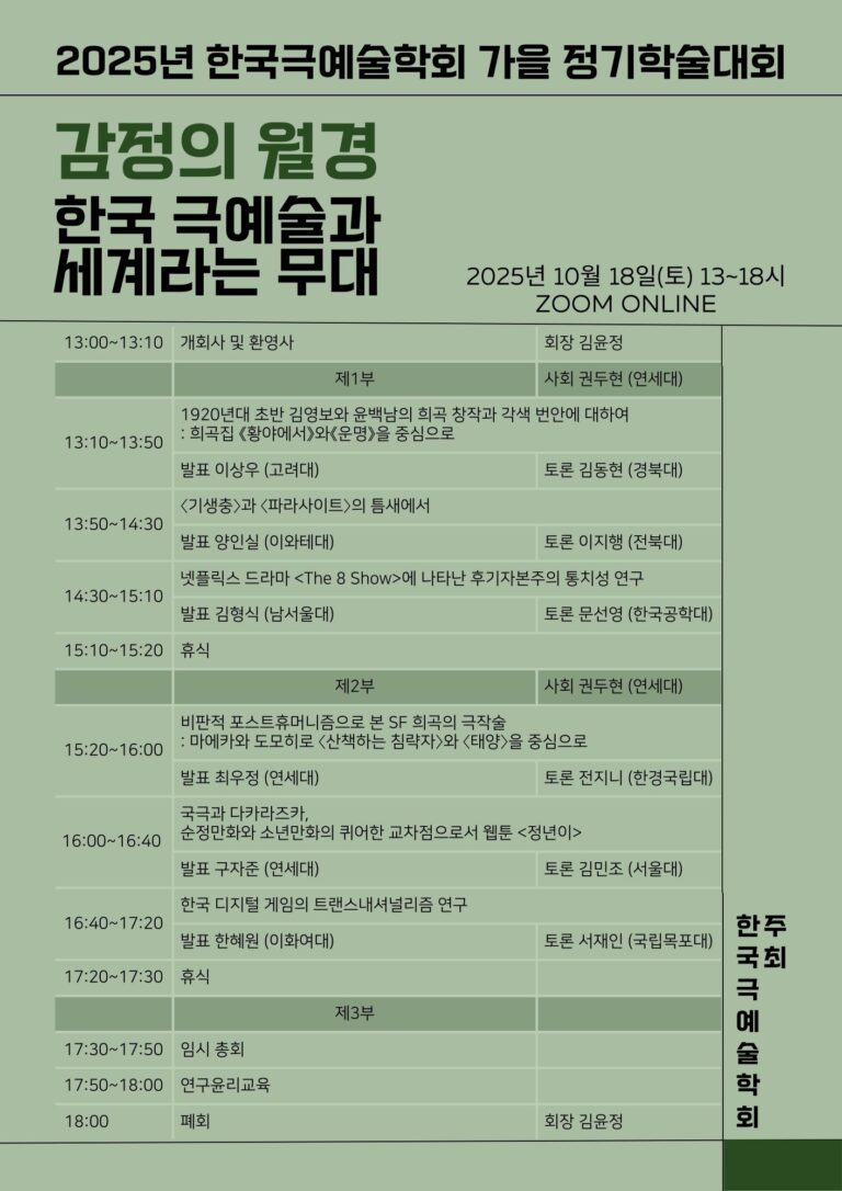 행사 정보 행사 유형: 학술대회 주최: 한국극예술학회 일시: 2025년 10월 18일 오후 1시 ~ 2025년 10월 18일 오후 6시 장소: 온라인 진행 방식: 온라인 참여 링크 온라인 참여 링크 행사 소개 안녕하세요, 한국극예술학회입니다. 한국극예술학회가 2025년 가을정기학술대회를 다음과 같이 개최할 예정입니다.…